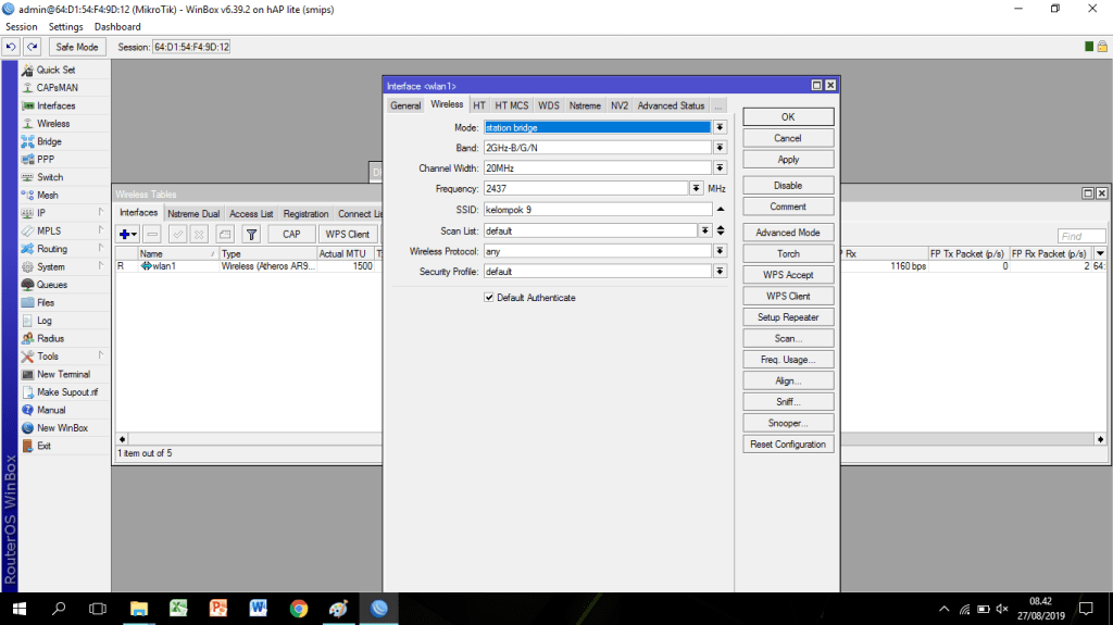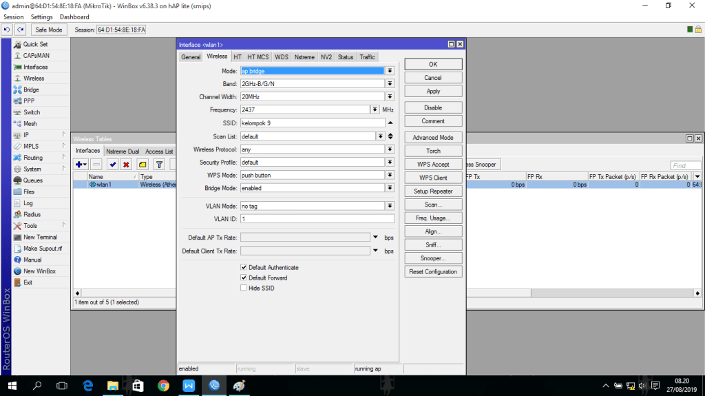 Klik Wireless -> klik wlan -> pilih wireless -> klik mode(pilih AP Bridge) -> klik frequency lalu di scan (mencari signal terkecil) -> klik SSID (nama kelompok)-> klik Apply -> klik ok.