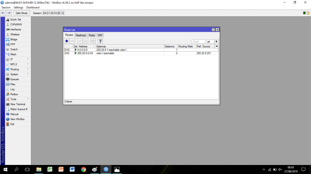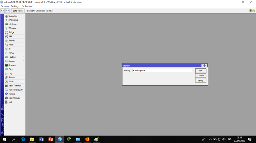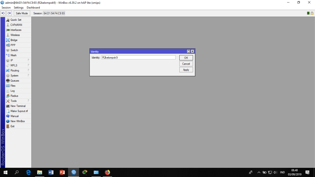 9. Apabila konfigurasi sudah selesai. kita bisa mengganti nama mikrotik tersebut dengan cara: