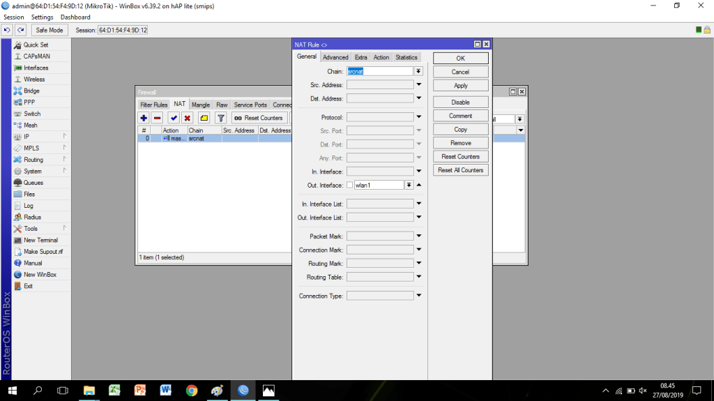 Klik IP -> klik firewall -> klik NAT -> klik tanda (+) -> klik General lalu isi out interface dengan wlan 1 ->klik Action lalu isi masquerade ->klik Apply ->klik ok.