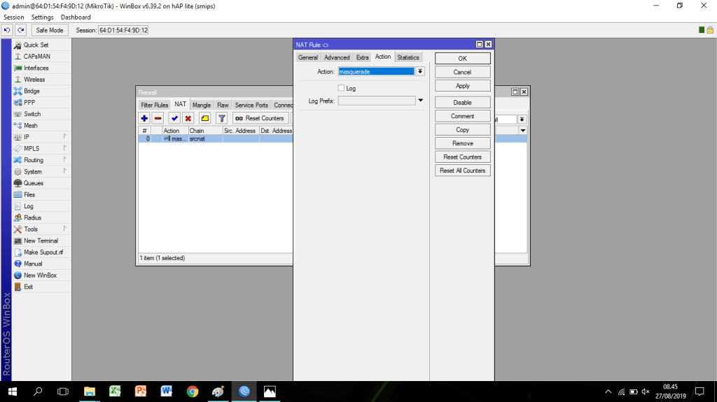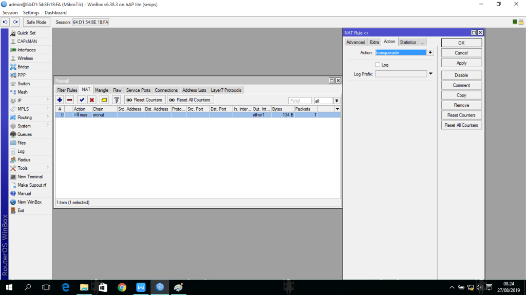 Klik IP -> klik firewall -> klik NAT -> klik tanda (+) -> klik General lalu isi out interface dengan ether 1 ->klik Action lalu isi masquerade ->klik Apply ->klik ok.