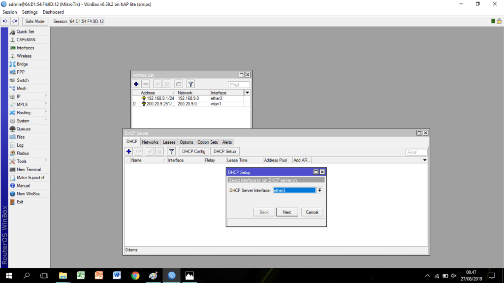 Klik IP -> klik DHCP Server -> klik DHCP Setup ->pilih ether 3